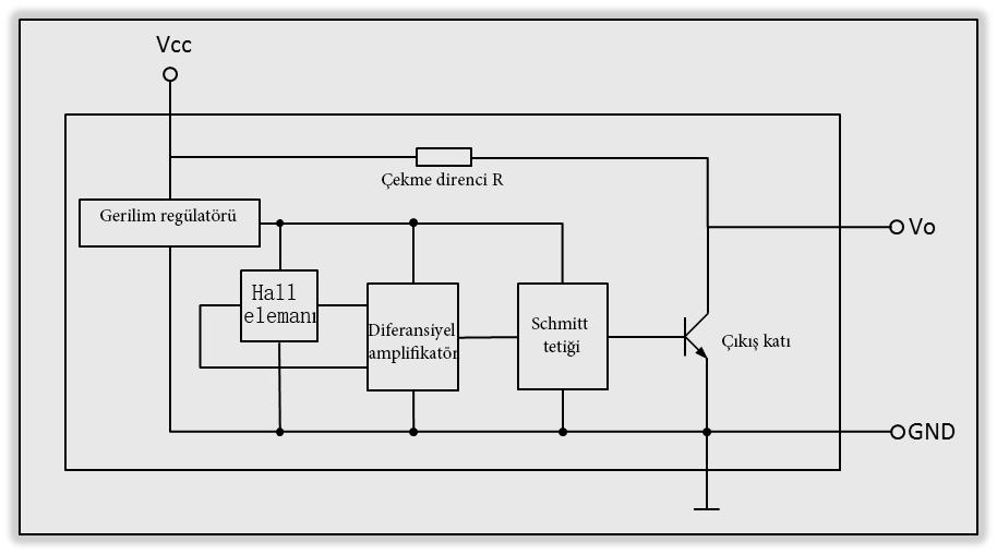 AH413 Hall sensörü, çift kutuplu, uyarımlı, tek uçlu, dijital çıkışlı Hall entegre devredir. Çıkış sinyalinin bir mandal fonksiyonu vardır. Sensör yongasının dahili gerilimi koruyucusunda, gerilim regülatörü, sıcaklık kompanzasyon devresi, Hall voltaj üreteci, sinyal yükselteçleri, schmitt tetikleyicisi ve açık kolektör çıkış devresi gibi devreler vardır. Voltaj regülatörünün sıcaklık dengeleme devresinin mükemmel performansı, sensörün geniş bir voltaj aralığında ve stabil sıcaklık aralığında olmasını sağlamaya yarar. Ters voltaj koruma devresi, sensörün ters voltajla hasar görmesini önler.